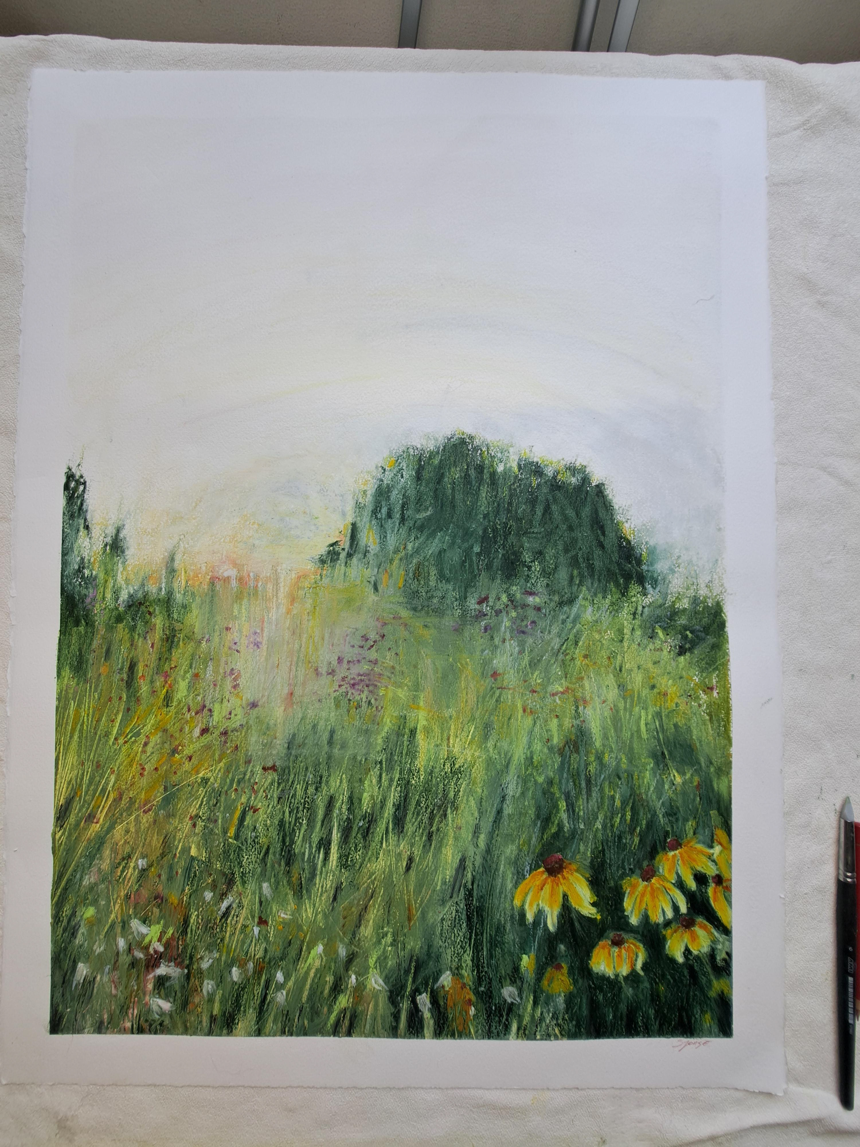 The technique of Sennelier oil pastel on Arches Oil paper creates accumulating layers. The greens breathe among one another—some opaque, others translucent, none struggling for dominance. The vertical strokes suggest organic growth, unhurried. The sky remains discreet, almost absent, because it does not need to assert its vastness; it is simply there.